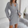 Podzim Zima Sexy Zavinovací Boky Vlněné Šaty Jednobarevné Křížený V Výstřih Netopýří Rukáv