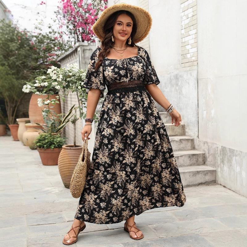 Women's Summer Plus Size Long Dress Square Collar Short Sleeve Floral Print Maxi Dress