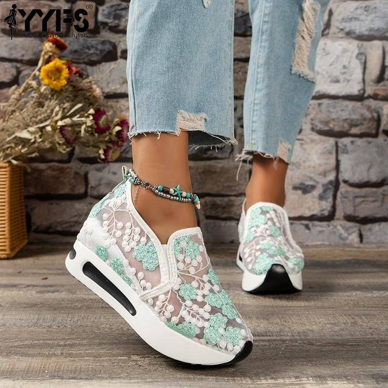 Order a size up. Women's platform wedge sneakers. Mesh floral embroidery sneakers for women. Casual comfortable slip-on heeled shoes for women.