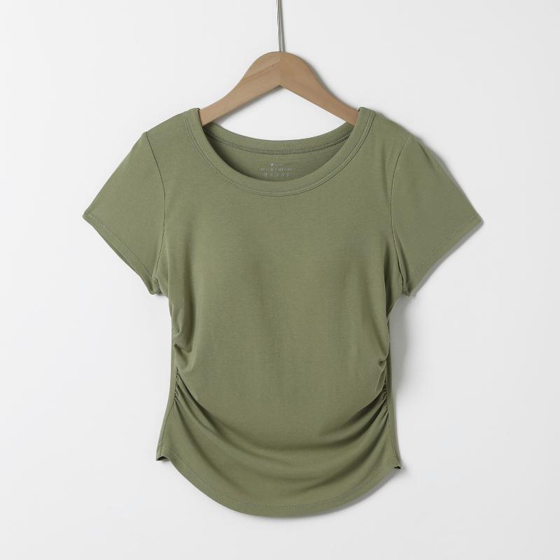 Fashion side pleated swallowtail short sleeve waist-closed round neck short sleeve pure desire short sleeve T-shirt women
