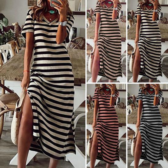 Ženy Letní Midi šaty Boční dělený výstřih do V Krátké rukávy Délka do poloviny lýtek Barevně ladící Slim Fit šaty Dámské oblečení