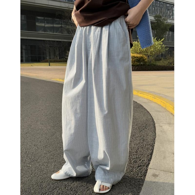 Johnature Korean Lazy Relaxed Striped Women Pants Spring Summer Casual Elastic Waist Loose Wide-leg Trousers