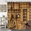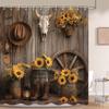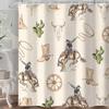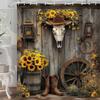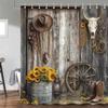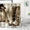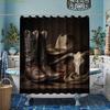 4dílné západní sprchové závěsy se předložkami, sprchový závěs ve stylu venkovského stodolového dveře, voděodolná látka, hnědý sprchový závěs, lebka býka, kovbojské boty, klobouk
