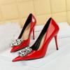 2025 New Luxury Pointed Toe Thin High Heels Big Rhinestone Buckle Design Women Patent Leather Stilettos Party Single Shoes
