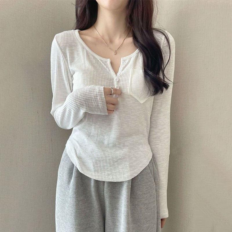 Slim Fit T-shirt Women's Early Autumn Thin Versatile V-neck Slim Short Long Sleeve Inner Base Layer Knit Top