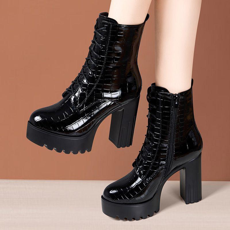 10cm British Patent Leather Boots Women's Block High Heels Shoes Fall Winter 2025 Thick Bottom Platform Ankle Motorcycle Boots