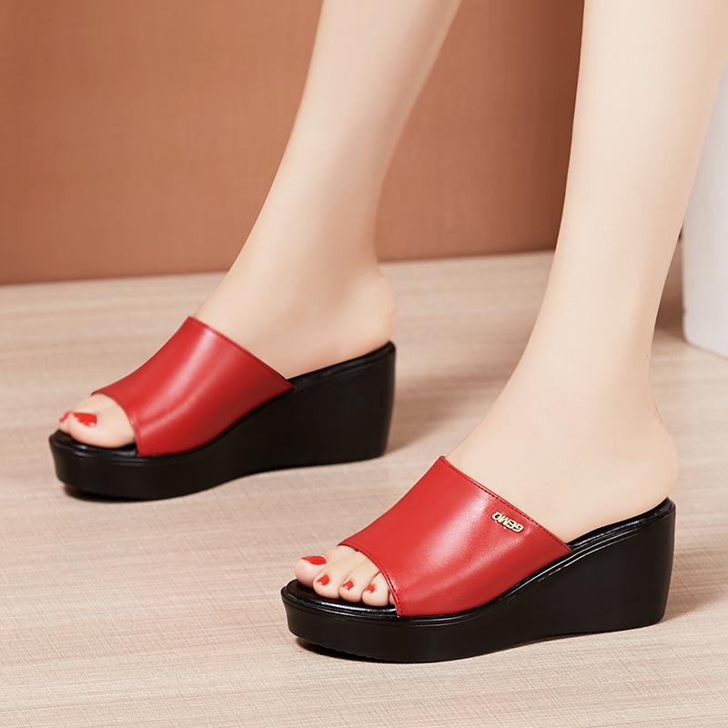 6cm Small Big Size 32-43 Comfortable Soft Leather Slippers Women Slides 2025 Summer Med Heels Platform Wedges Shoes Mom Beach