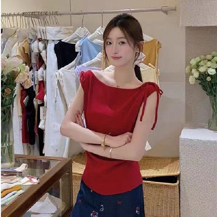 A New Design of Off-the-shoulder Short-sleeved T-shirt for Women Featuring A Slanted Shoulder Strap and A Slimming Short Top