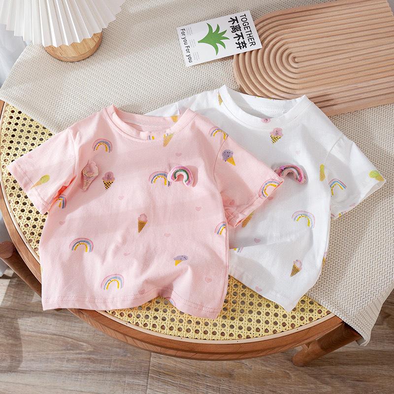 2024 Rainbow Print T-Shirt: Baby Girl's Cotton Short-Sleeve Summer Top