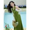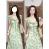 Gentle temperament waist-wrapped hip-split long dress French green v-neck ruffle edge floral neck dress