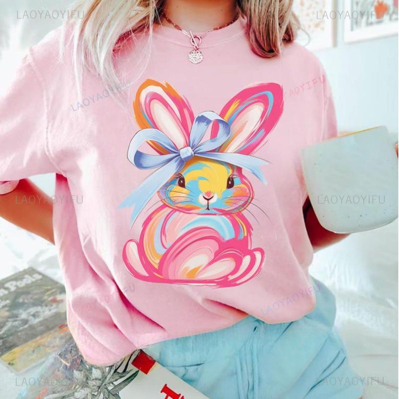 Brushstroke Bunny Easter T Shirt Kawaii Women Short-sleev Tee-shirt Retro Style Streetwear Fashion Casual Cotton Tops Ropa Mujer