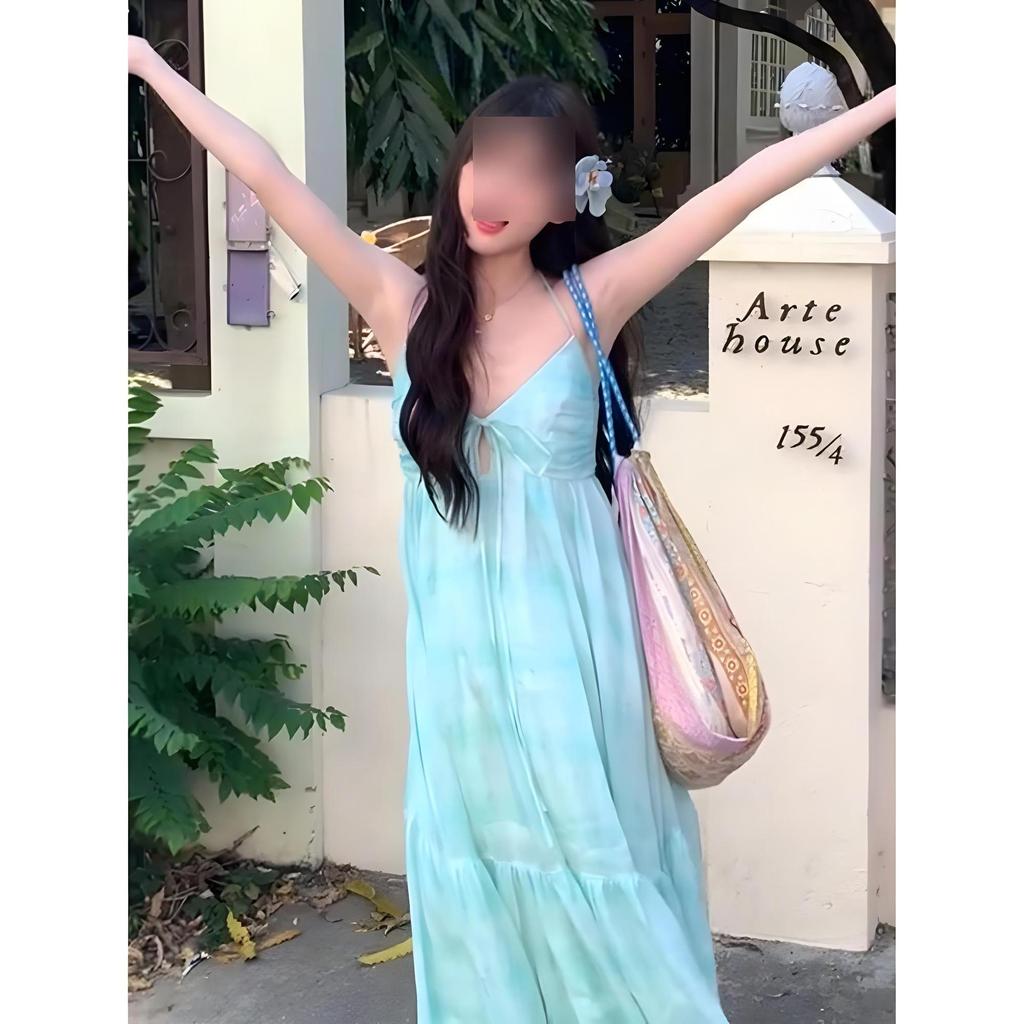 Travel wear beach dress seaside vacation neck sling dress backless strap big swing dress