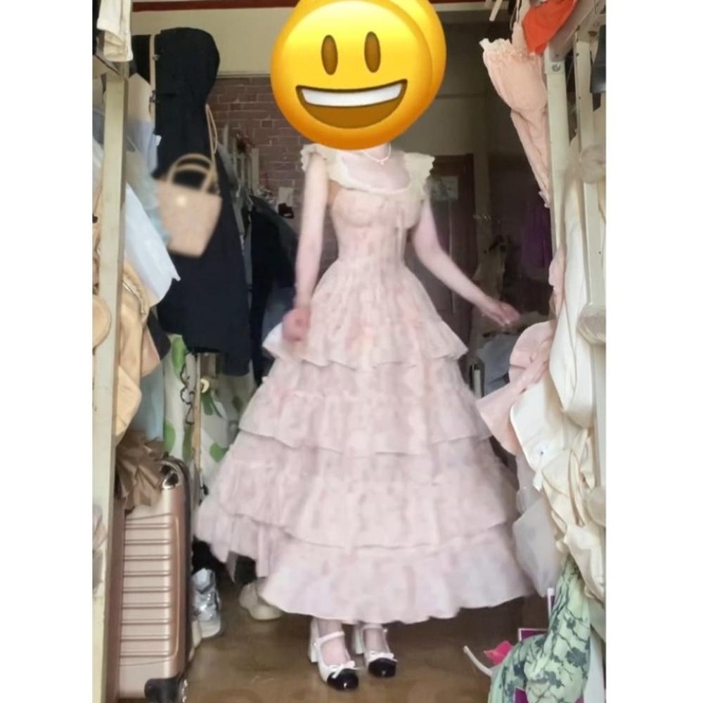College blue floral puffy dress women's summer dopamine sweet embroidery suspender cake dress waist dress