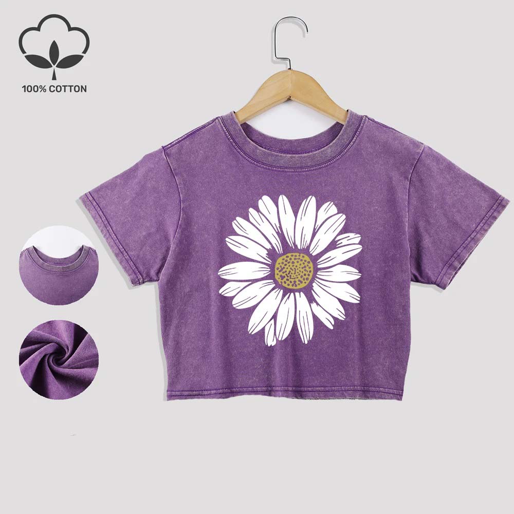 Beautiful Sunflower Prints Cotton Washed T-Shirt Trend Summer Lace Hem Crop Tees O-Neck Regular Fit Short Sleeve Casual Clothes