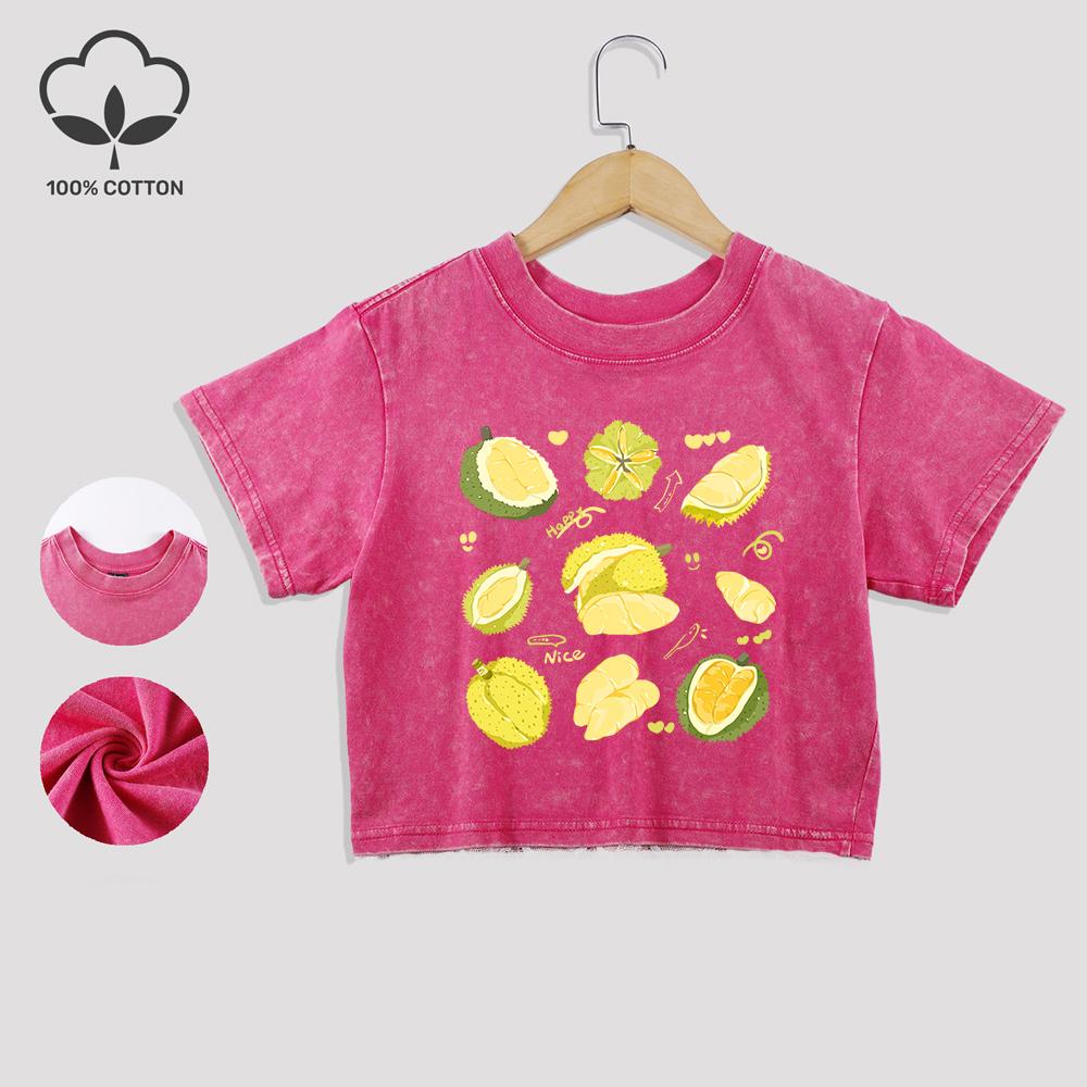 Delicious Durian Printed Cotton Washed T-Shirt Trend Summer Lace Hem Crop Tees O-Neck Regular Fit Tops Casual Female Clothes