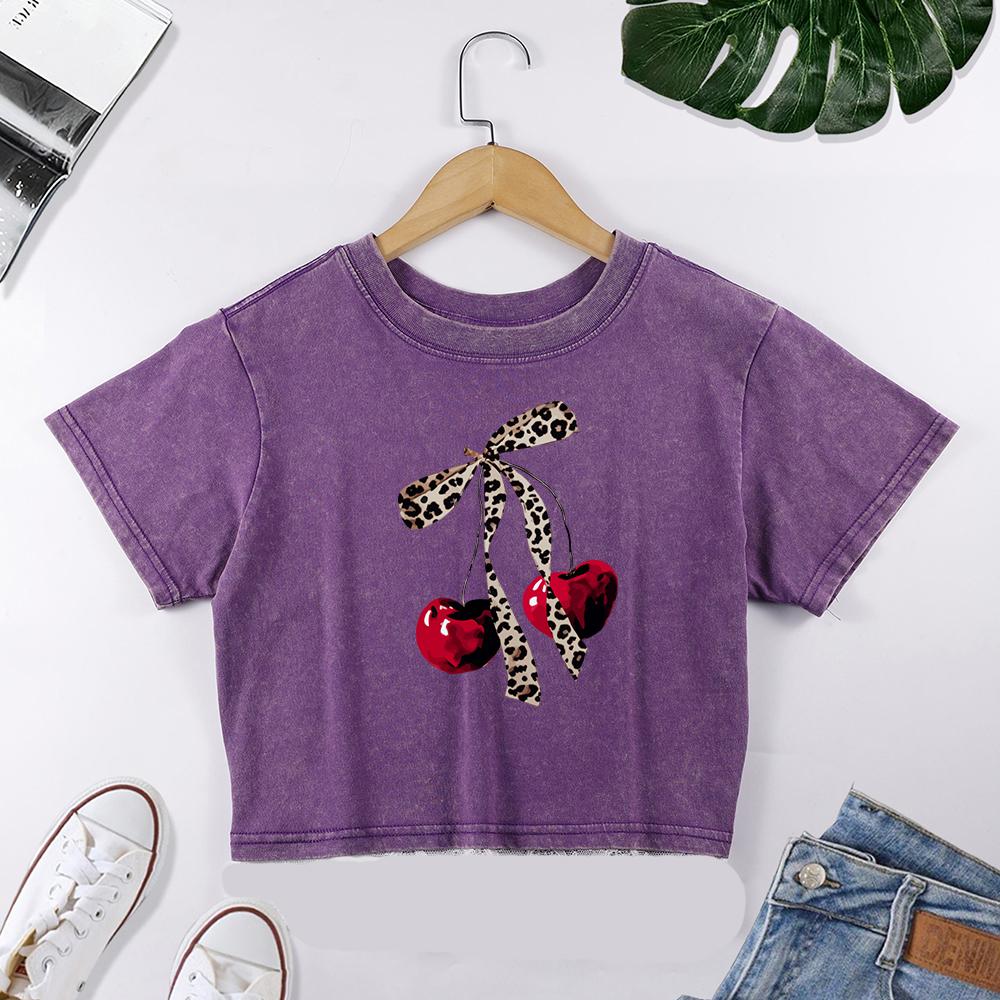 Leopard Print Bow Cherry Prints Women Lace Washed T Shirt Summer Casual Tee Shirts Y2K Short Sleeve Cotton Slim T-Shirts
