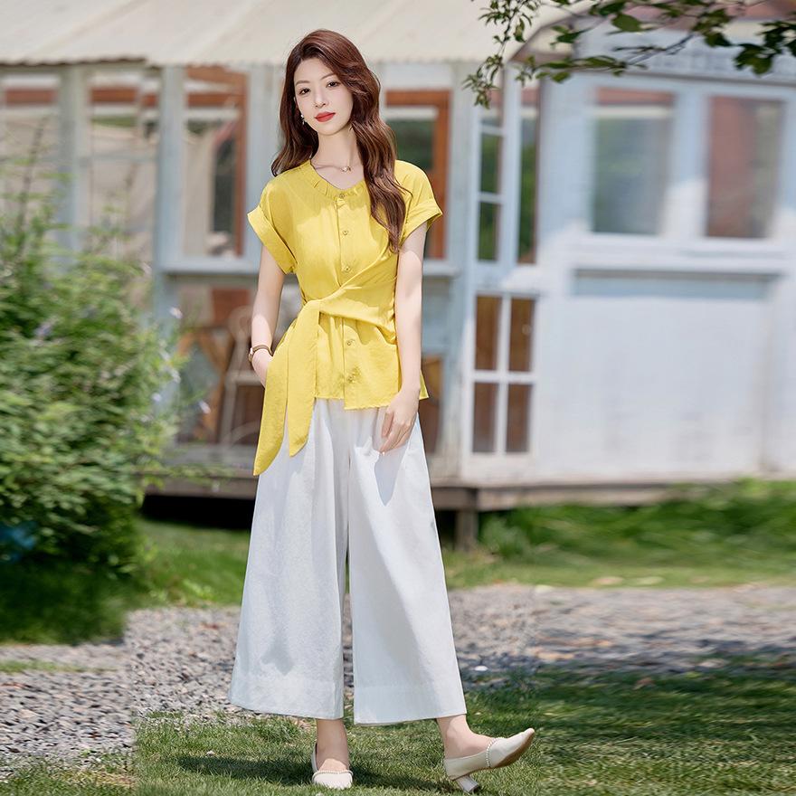 Cotton and linen suit women's summer new fashion temperament lace-up waist shirt nine-point wide-leg pants two-piece set