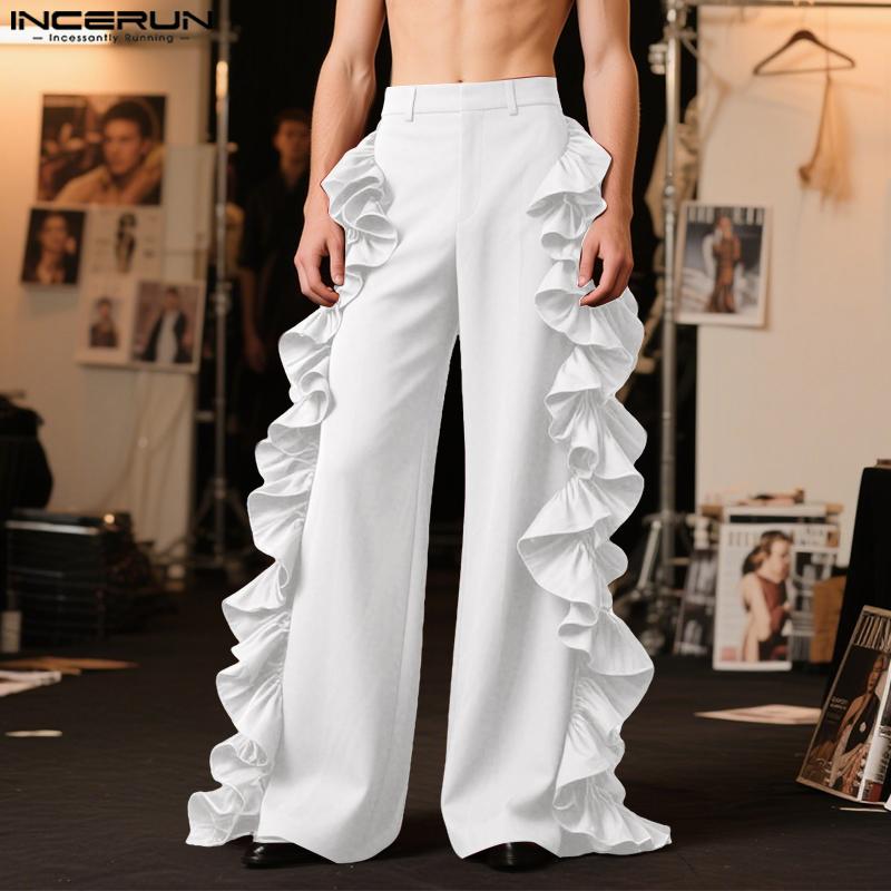 INCERUN S-5XL Pánské kalhoty s vysokým pasem, volánovými vrstvami na straně, ležérní, dlouhé