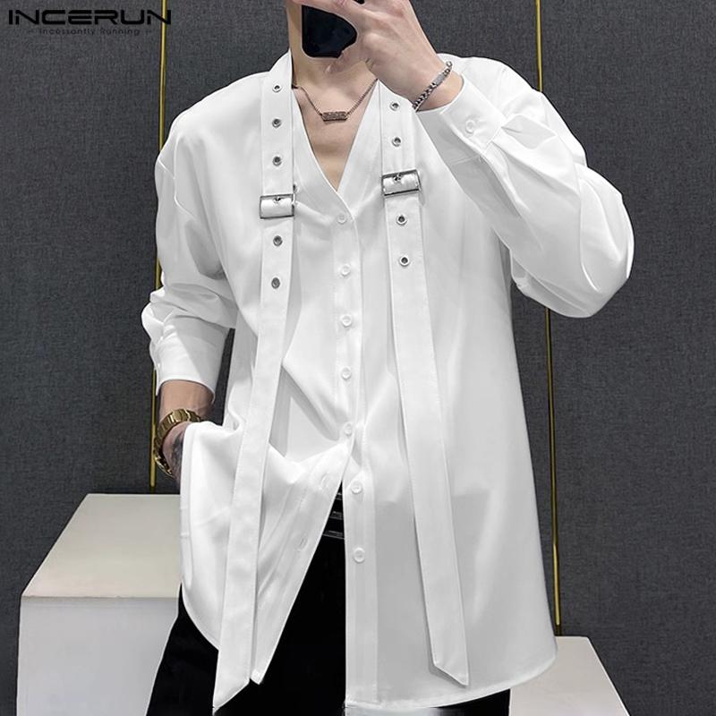 INCERUN Pánské tričko s výstřihem do V, ramenní stuhou, dlouhým rukávem, knoflíky, nadměrné