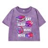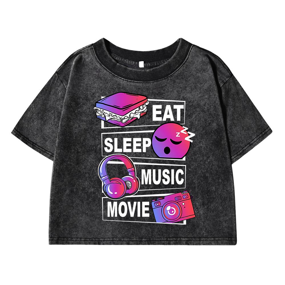 Eat Sleep Music Movie Funny Printing Women Washed Short T Shirt Summer Breathable Tshirt Street Fashion Distress Top