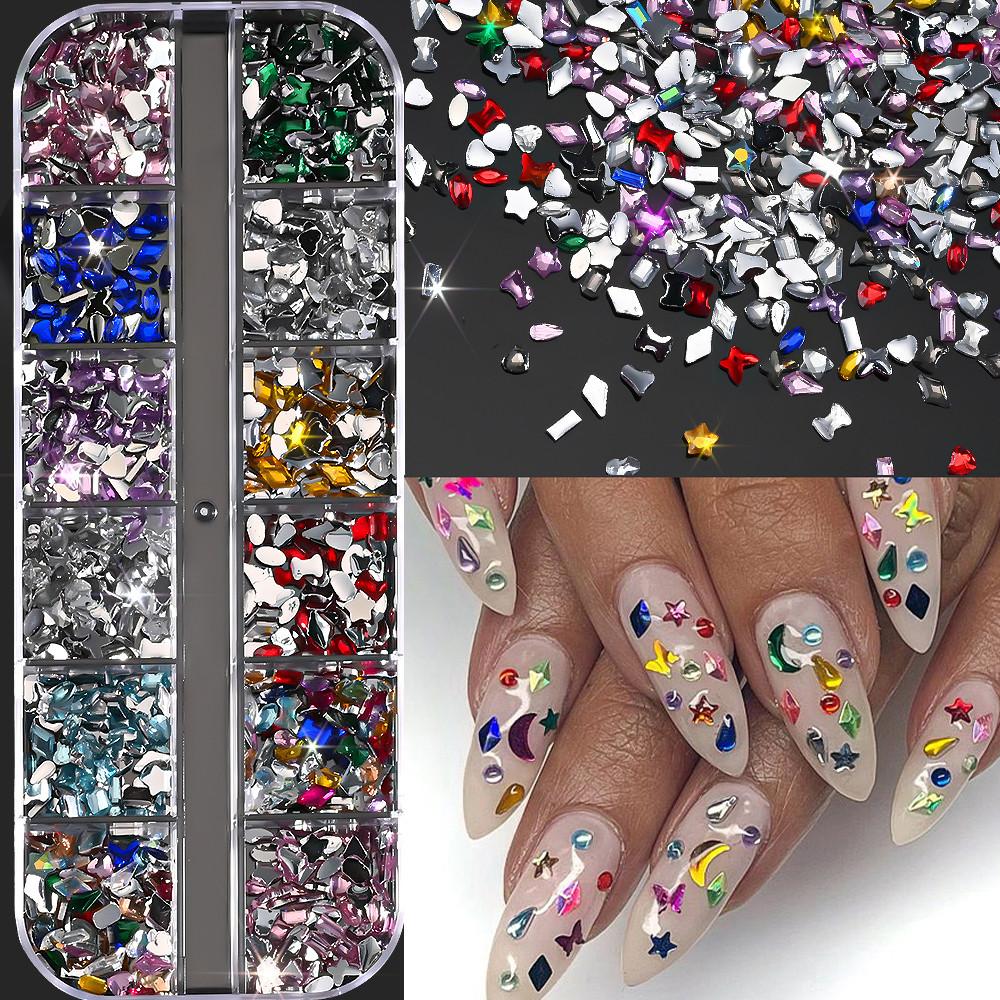 2000Pcs+ Colorful Rhinestones Nail Art Charms Multi Shape Crystal Flat Back Nail Gems 3D Mini Heart Star Butterfly Nail Diamonds