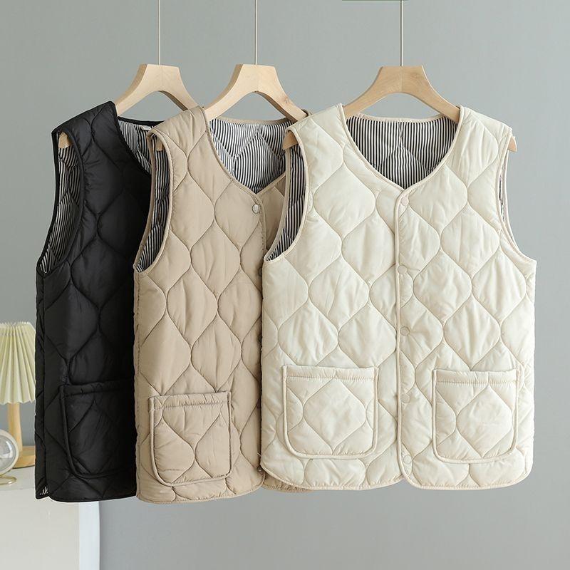 Winter Women's Multi Layer Vest with Storage Bag Thin Lined Button Closure V-neck Sleeveless Solid Color Windproof Heat-retaining Outdoor