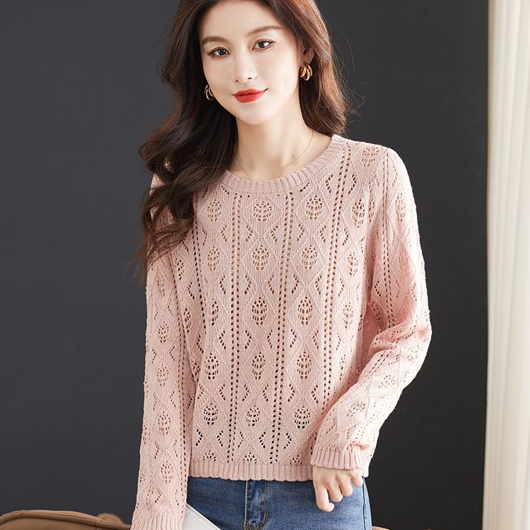 Nový krátký, volný a tenký dámský svršek pletený svetr s háčkovanými a prolamovanými vzory