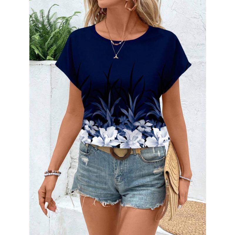 Summer Round Neck 3D Print Flower Pattern Top Fashionable Casual Short Sleeved Women's T-shirts