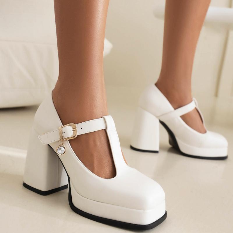 Classic Block High Heels Platform Shoes Girls Black White Women's Heeled 2024 New T-strap Spring Pumps Wedding Party Dance Shoes