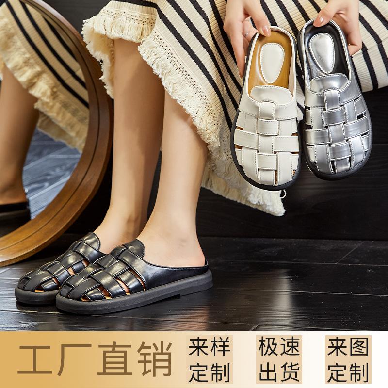 2025 summer new retro woven slippers hollow and breathable flat-bottomed sandals bag head wear half-drag fashion women's shoes