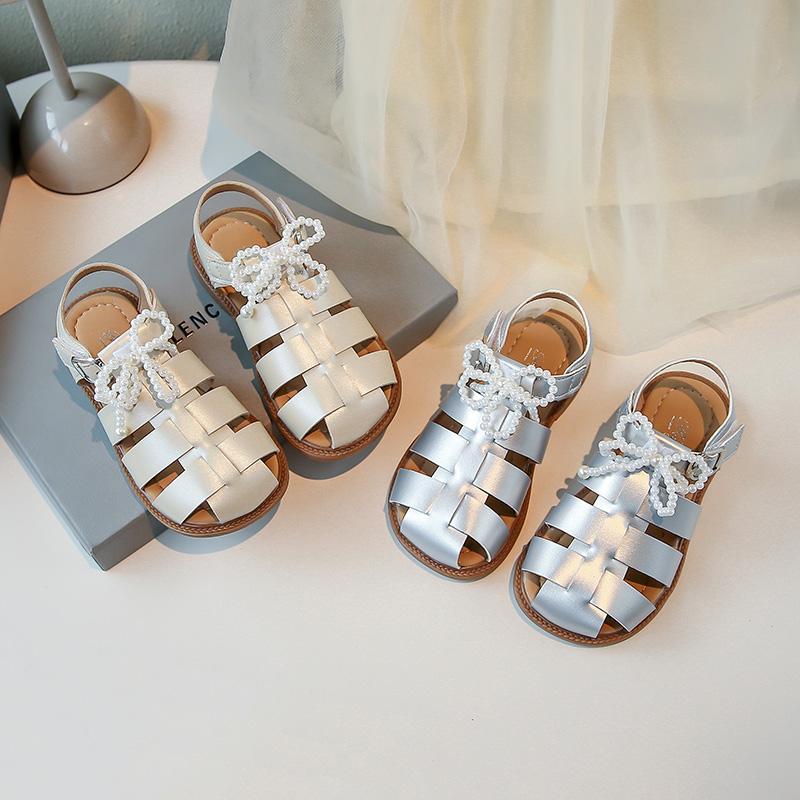 Girls Sandals Soild Color Versatile Kids Princess Shoes Beading Bows 2025 Summer New Children Beach Shoes Hook&loop Soft Sole