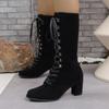 Winter New Coarse Heel Shoes Women's Round Head Suede Front Cross Strap Rivets Anti-slip Wear-resistant High Boots
