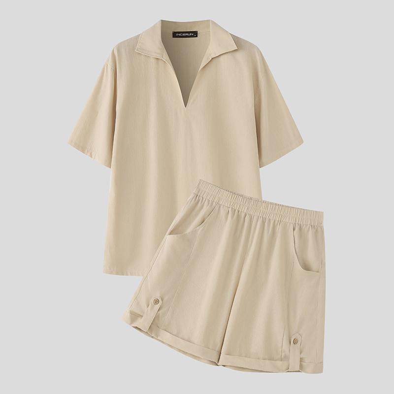 INCERUN Two Piece Suit Men V Neck Short Sleeve Shirts Shorts Casual Outfits Sets