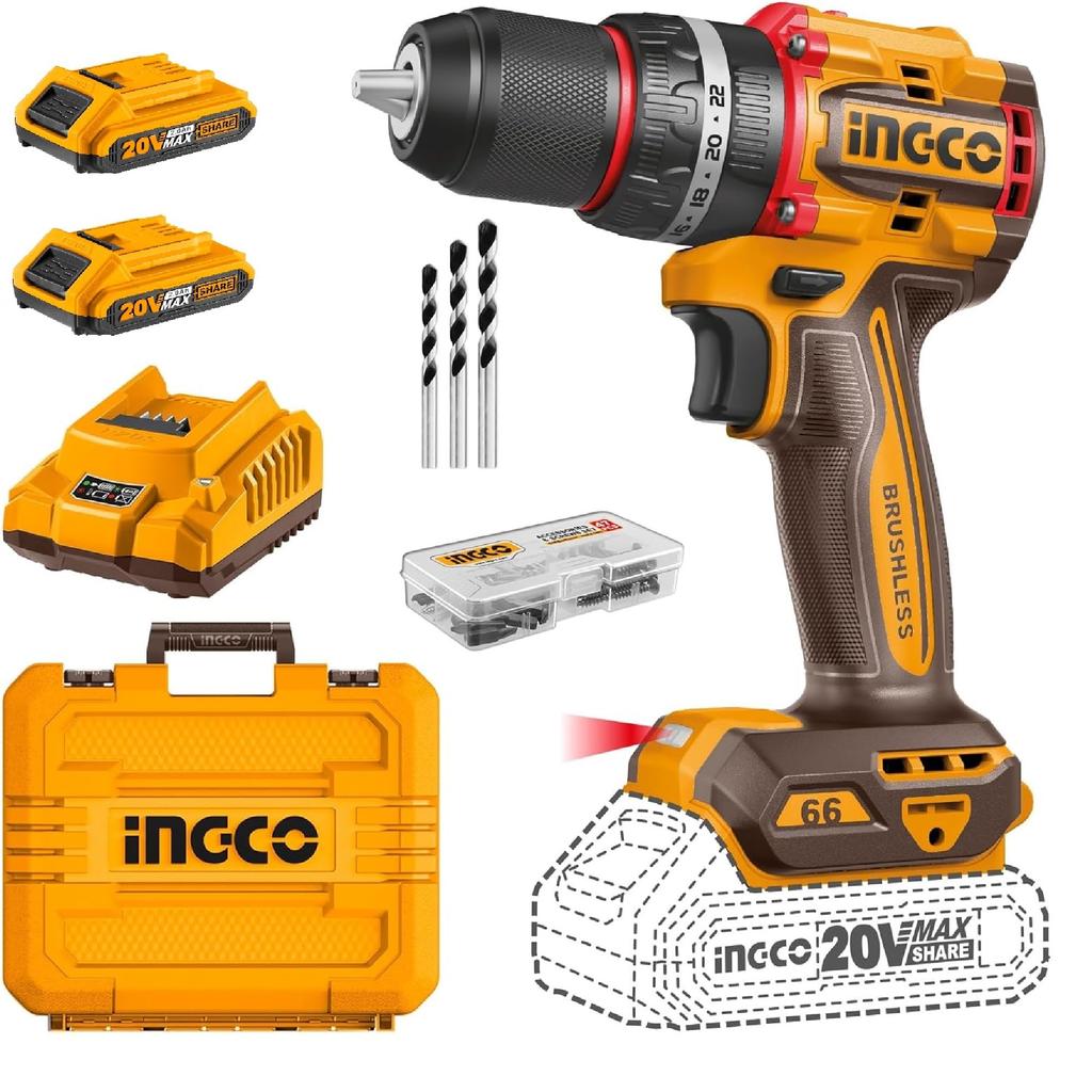 INGCO 20V Brushless Impact Drill with 66 Nm Torque 2×2.0 Ah Batteries and Charger
