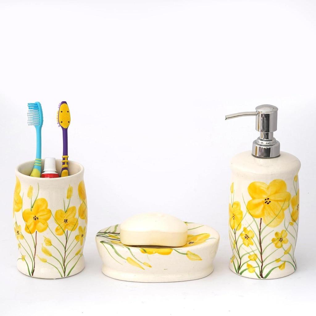 Prémiová keramická koupelnová sada 3 kusů | Moderní ručně malovaná koupelnová sada s 300ml dávkovačem mýdla, držákem na zubní kartáčky a miskou na mýdlo | Koupelnové doplňky | Bílý a žlutý květinový vzor
