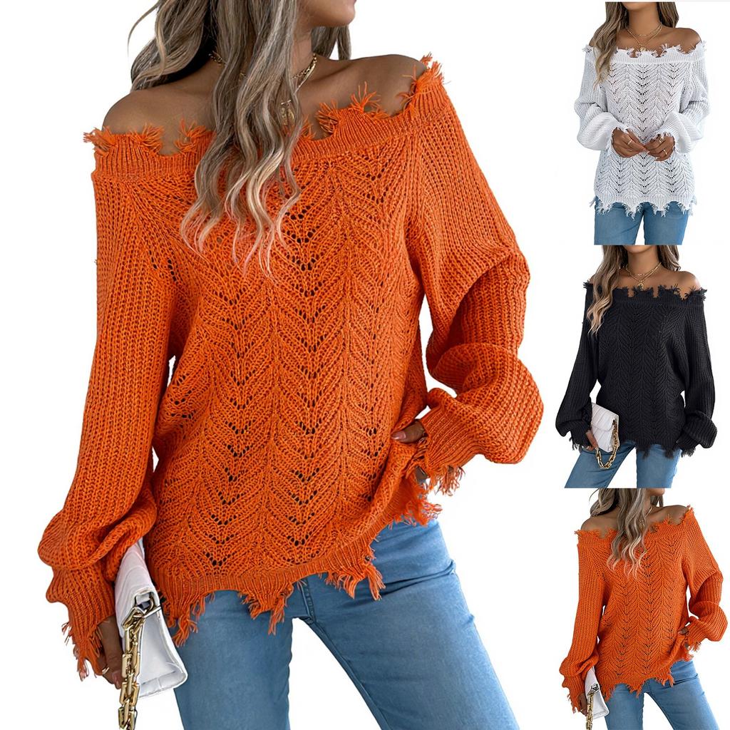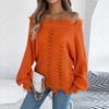 Dámský módní jednobarevný dutý svetr s dlouhým rukávem a odhalenými rameny