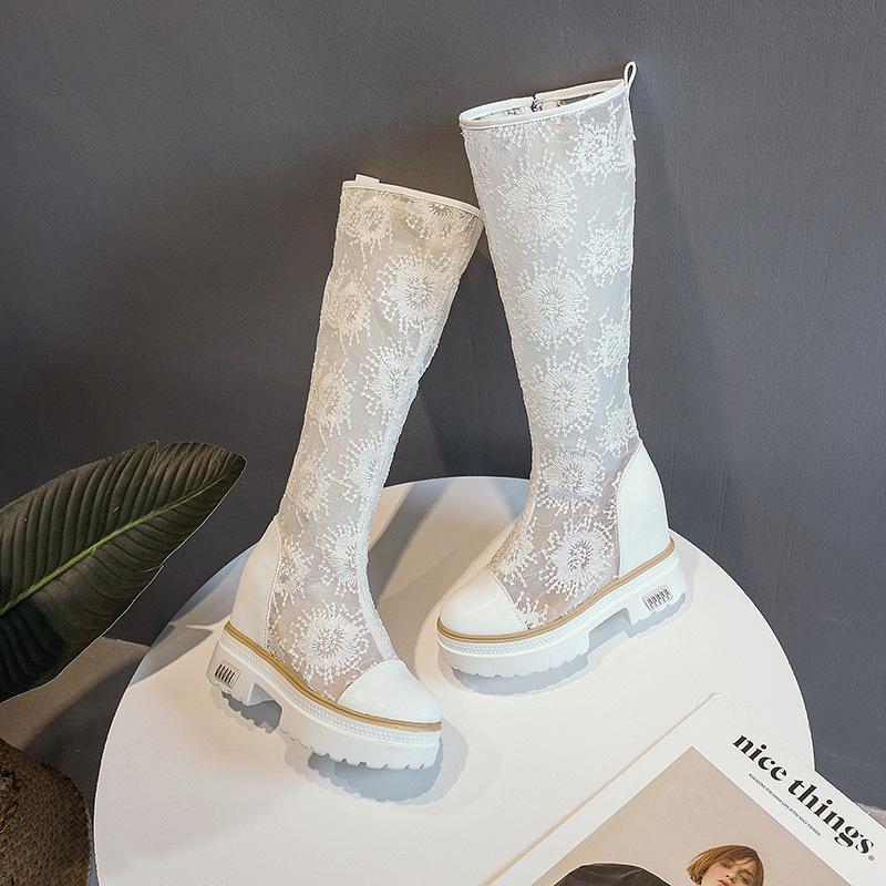 Bílé vyšívané síťované kozačky pro jaro/léto 2025, nové prodloužené kozačky, síťované prodyšné a všestranné dámské kozačky