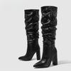 Size 35-42 White Pleated Leather Long Boots Women Autumn Winter Chunky Heels Motorcycle Knee High Shoes Botas Largas Mujer