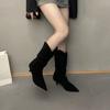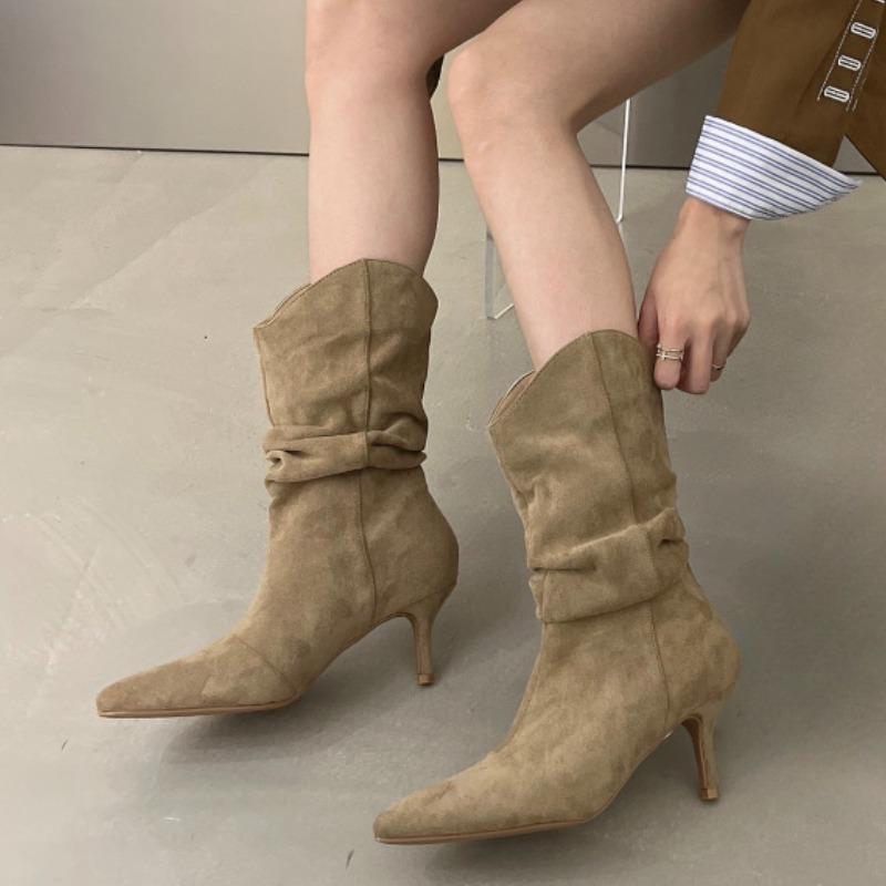 Vintage Pointed Toe Women Pleated Mid Calf Boots Fashion Slip on High Heels Shoes Autumn Winter Ladies Shoes