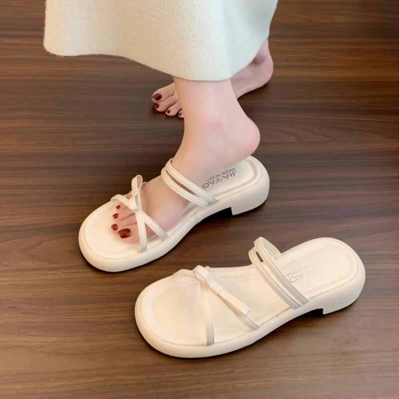 Silver bow slippers women's summer wear new fashion sandals with skirt thick heel cool slippers