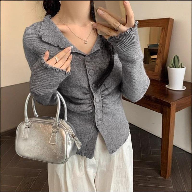 Lapel fungus edge knitted cardigan sweater women's autumn new slim waist top trendy