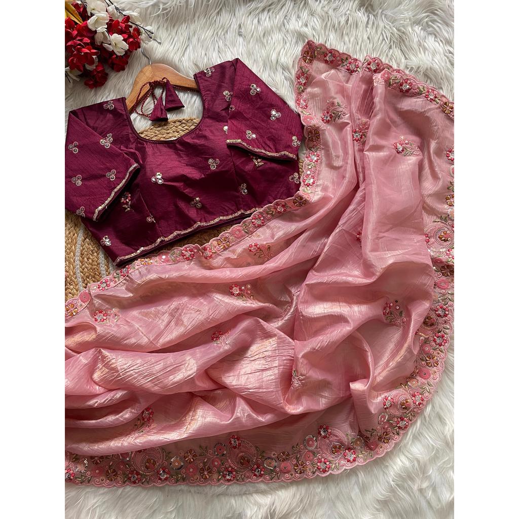 2)⭕SAREE FAB. : Prémiová zlatá mačkaná látka s vícevláknovou flitrovou pallu prací s obloukově střiženou bordurou