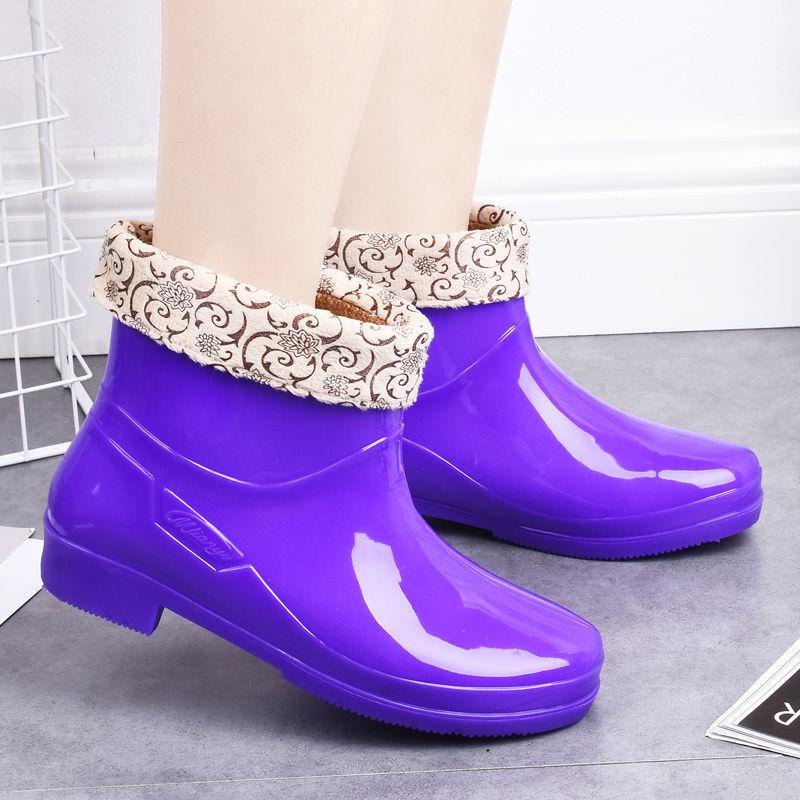 Feerldi Purple Women Waterproof boots Low Heels Colorful Polka Dot Rain boots for women Plush Warm Water Shoes
