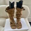 Fashion square head open-toed elastic fleece cool boots summer new belt buckle splicing sleeve low heel high boots women