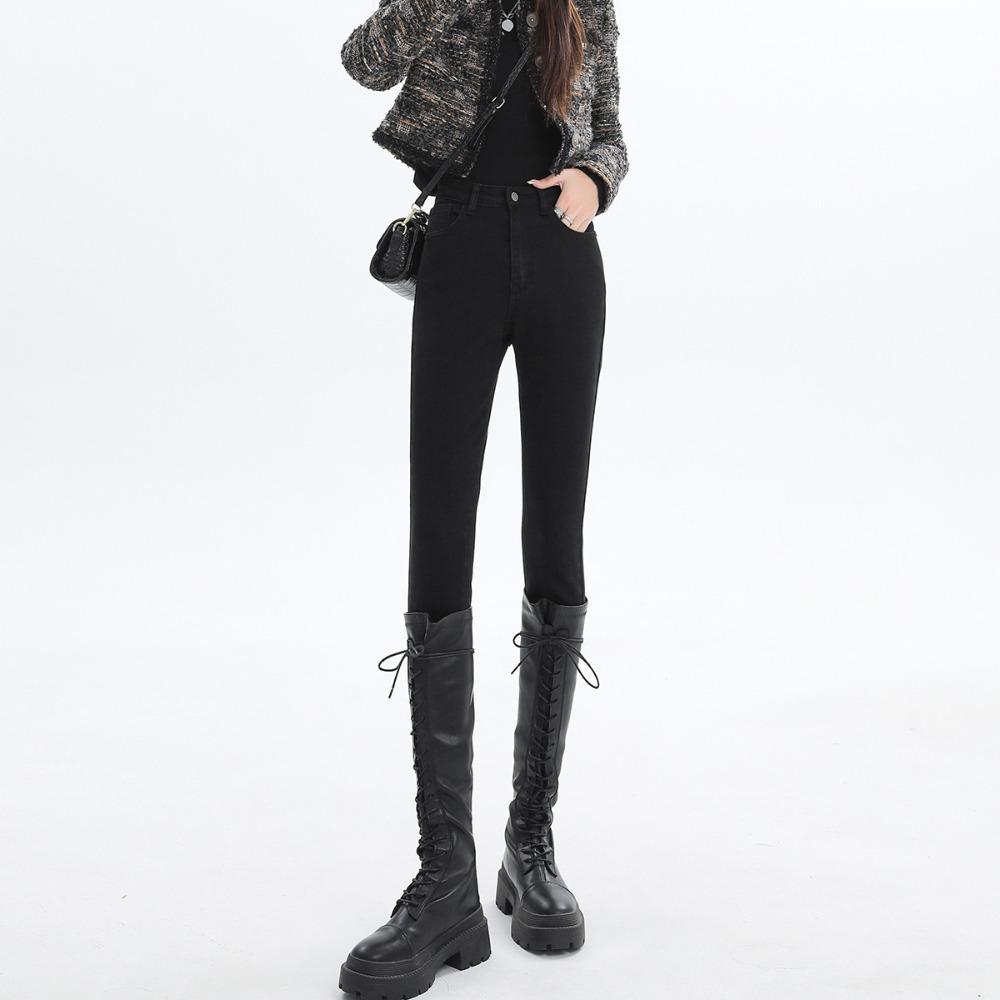 Personalized high-waisted elastic small-footed jeans for women's 2025 new velvet slim-fitting and thin pencil pants