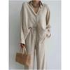 This stylish women's casual set features a loose long sleeve shirt paired with wide leg pants, perfect for a relaxed and comfortable look. The shirt has a button front and adjustable drawstring waist for a customizable fit, while the sleeves can be rolled up for a laid-back vibe. The wide leg pants offer a breezy and effortless style with natural wrinkle texture. The set comes in a warm beige shade, with other color options available including black, dark brown, olive green, and bright pink. Ideal for everyday wear, this outfit combines comfort and fashion effortlessly.