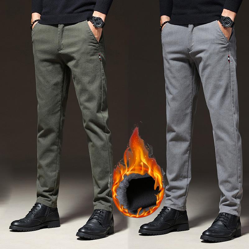 Winter Men's Warm Fleece Stretch Business Pants Elastic Waist Thick Fur Cotton Soft Slim Straight Trousers Male Brand Clothing