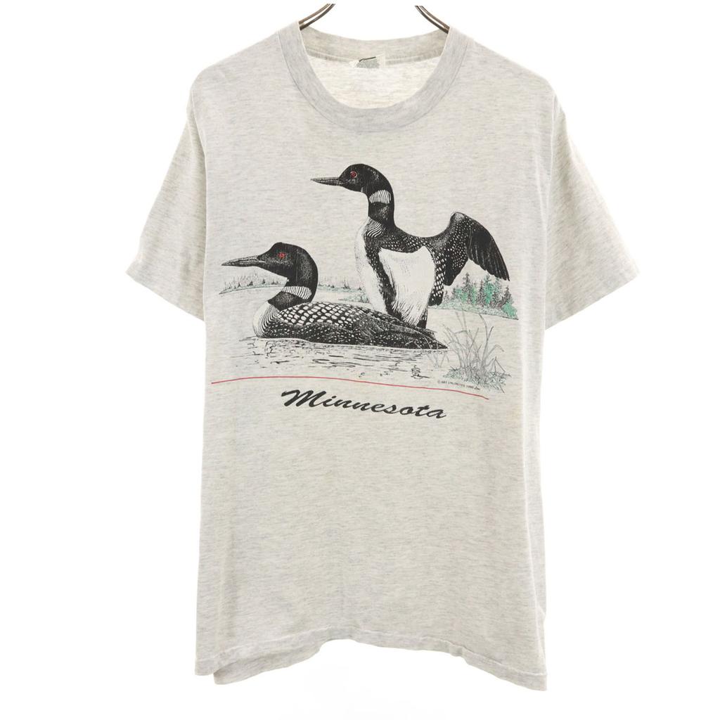This is an old print T-shirt from the 90s. There is some overall rubbish, peeling around the neck, and some light stains. Please understand that this is a used item before purchasing.