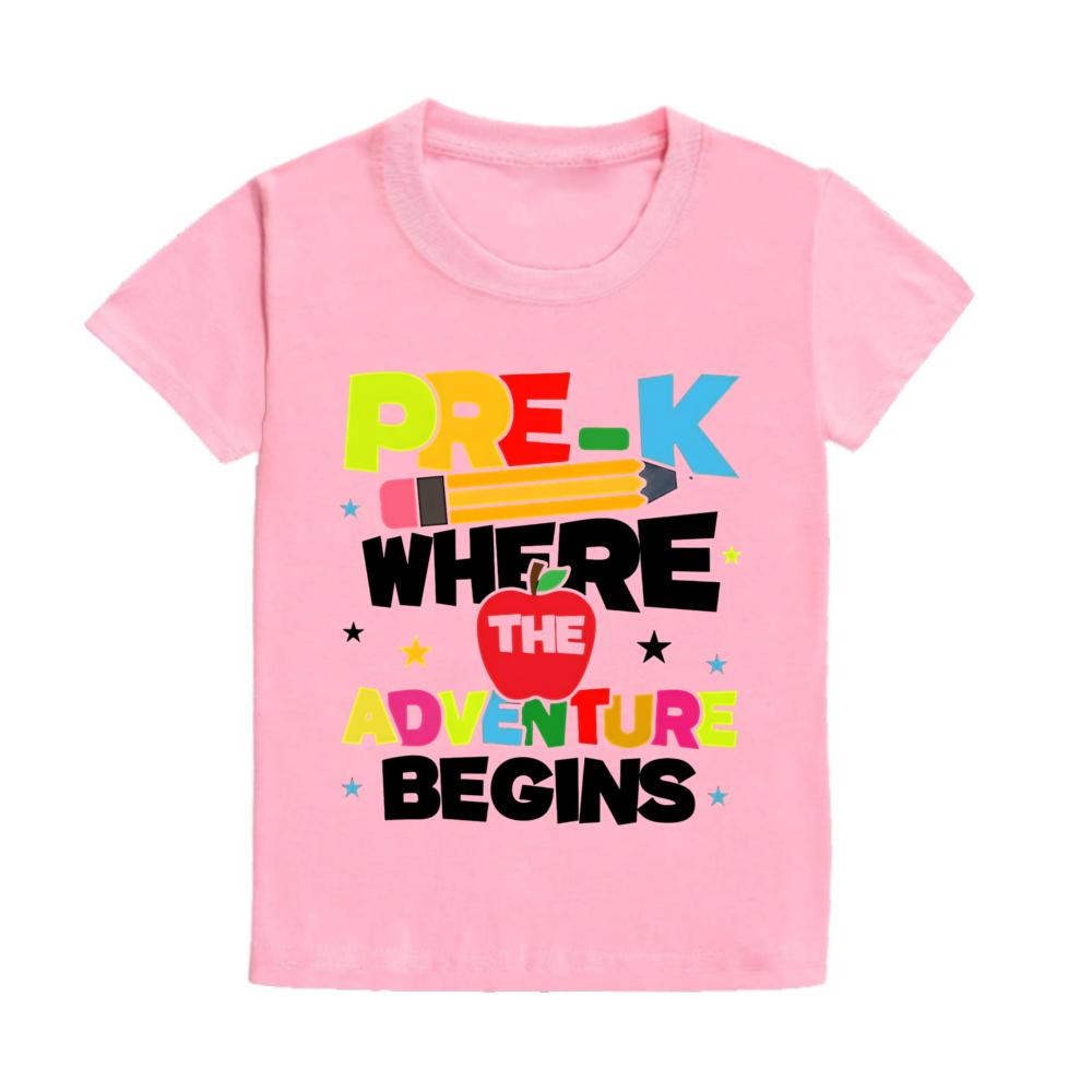 PRE-K WHERE THE ADVENTURE BEGINS Shirts Happy First Day of School Funny Tee Summer Casual Short Sleeved T-shirt