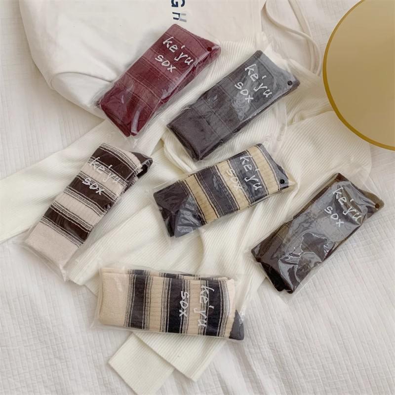Female Spring and Autumn Vintage Towel Bottom Stripe Solid Color Tall Cotton Socks